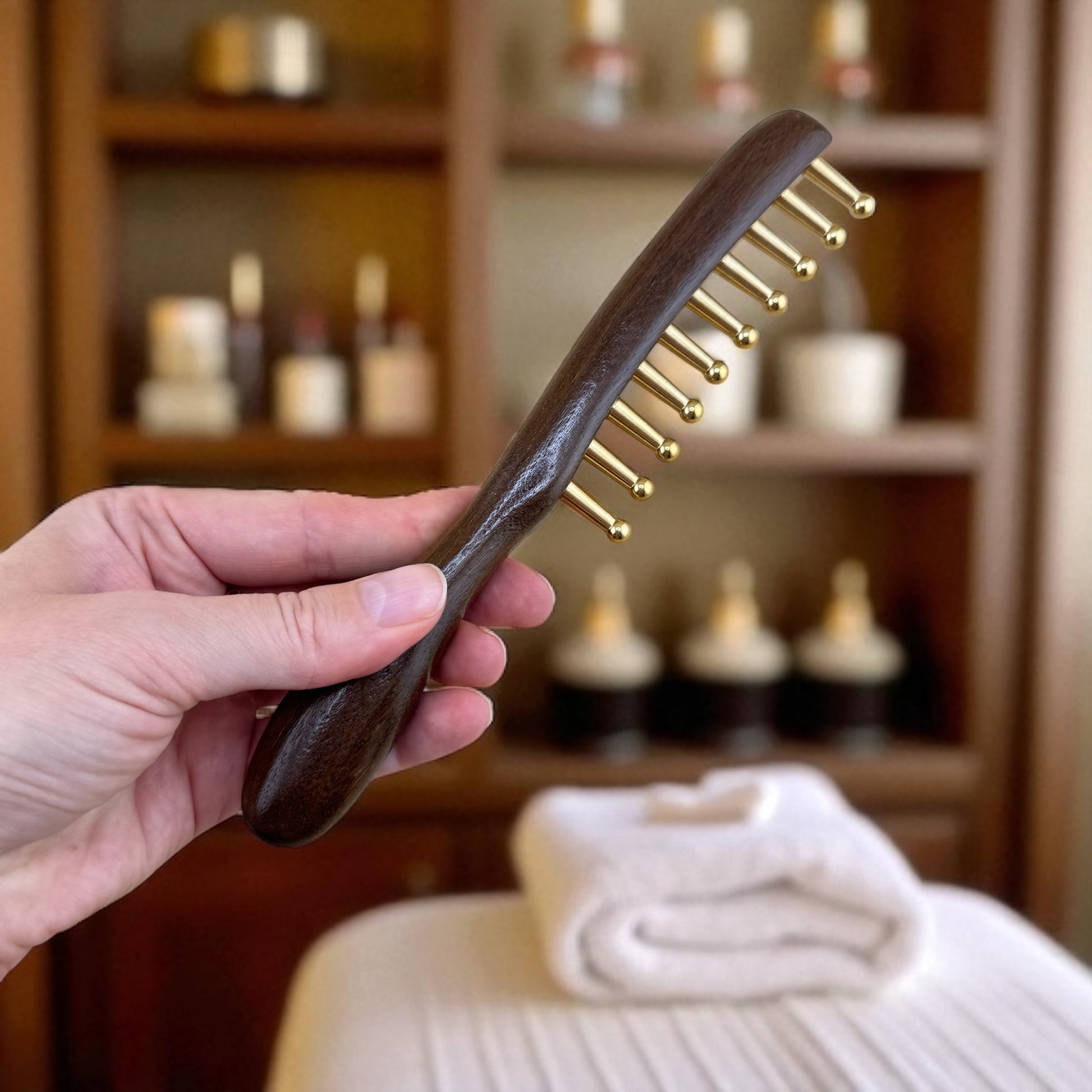 Copper & Wood Massage Comb – Ayurvedic lymphatic drainage tool for scalp & body; stimulates circulation and relieves tension.